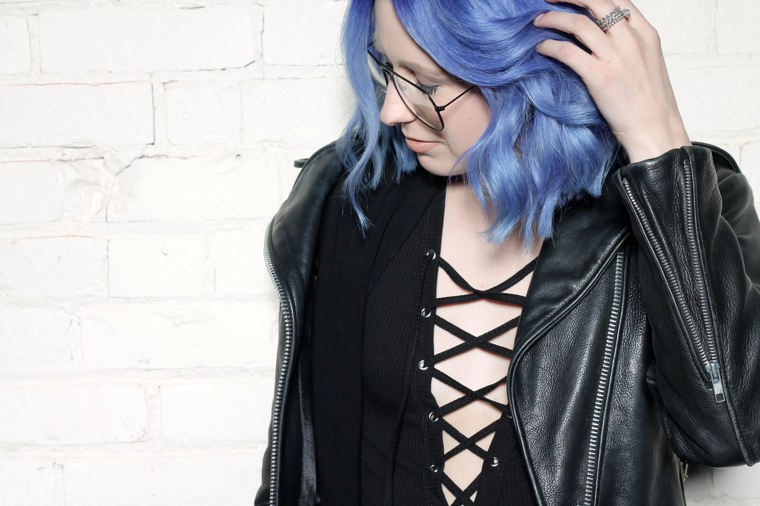 Shown wearing / Lace Up Bodysuit, Urban Planet; Leather Biker Jacket, Northbound Leather; Clear Lens Frames, Sunglass Spot; Rings, Pandora.